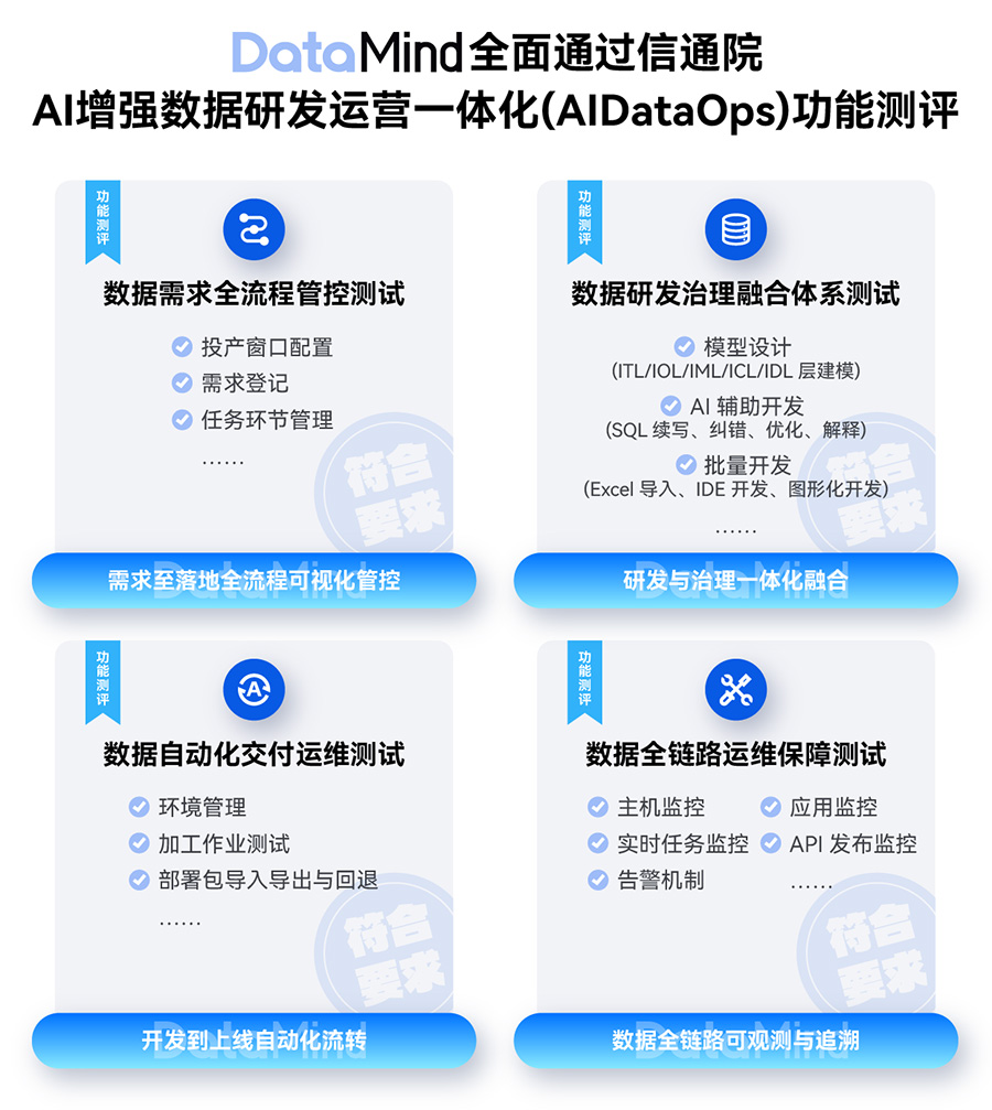 本次測評由信通院主導,依據《AI 增強 - DataOps 功能測試方案 V1.0 2025》標準,對DataMind的AI增強DataOps組件展開了全方位、深層次的功能驗證。