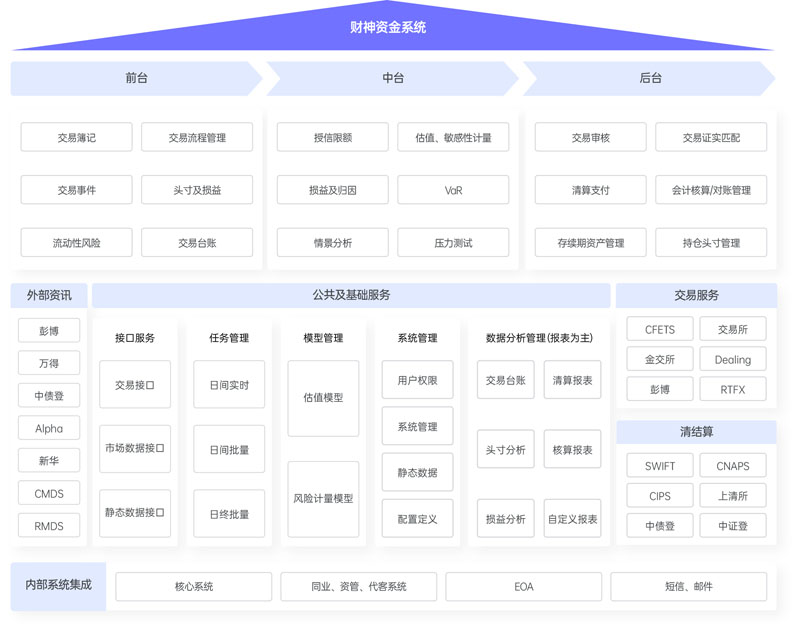 為金融機(jī)構(gòu)資金業(yè)務(wù)條線打造專(zhuān)業(yè)的、最大化自主可控的資金前中后一體化資產(chǎn)信息系統(tǒng),提供從前臺(tái)交易,中臺(tái)風(fēng)險(xiǎn),到后臺(tái)清算核算、報(bào)表統(tǒng)計(jì)等各項(xiàng)功能。